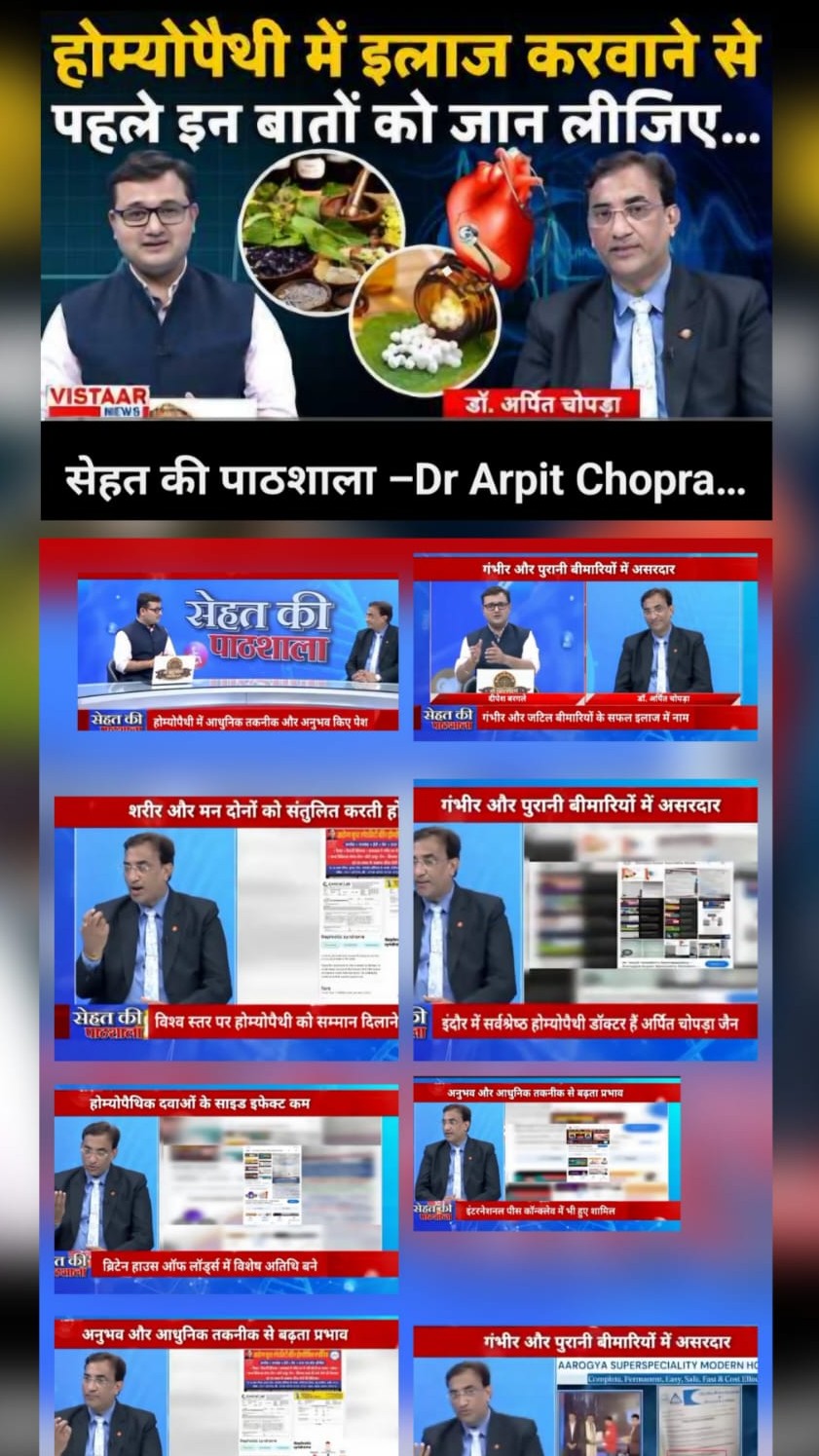 Exclusive Interview - Dr Arpit Chopra Jain MD Homoeopathy , Critical & Surgical Disease Specialist Homoeopathy at VISTAAR TV Programme Sehat ki Pathshala https://youtu.be/AAdIT9QwBPo?si=qyKsFgfNukV_t9D7, https://youtu.be/SV_3eVz1FNk?si=Pv65hbcmINqV5NDN https://youtu.be/C1nv-yi6Zb0?si=i6V7Tc4xc5c0vkfA Also watch “आधुनिक होम्योपैथी,भरोसेमंद इलाज।” Aarogya Super Speciality Modern Homeopathy- Dr. Arpit Chopra Jain Dr. Arpit Chopra Jain (MD HOMOEOPATHY & Critical & Surgical Disease Specialist)