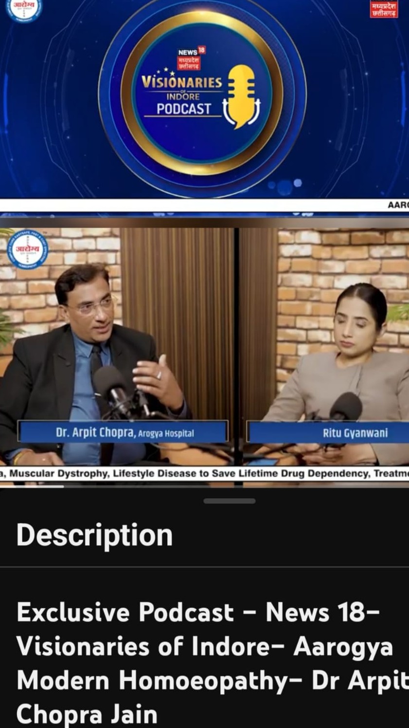 Exclusive Podcast – News 18– Visionaries of Indore – Aarogya Super Speciality Modern Homoeopathy Indore – Dr Arpit Chopra Jain https://youtu.be/40G2gOMnkZM?si=ohyzdVxu2NxlxhE4 Exclusive Interview - Dr Arpit Chopra Jain MD Homoeopathy , Critical & Surgical Disease Specialist Homoeopathy at VISTAAR TV Programme Sehat ki Pathshala https://youtu.be/AAdIT9QwBPo?si=qyKsFgfNukV_t9D7, https://youtu.be/SV_3eVz1FNk?si=Pv65hbcmINqV5NDN https://youtu.be/C1nv-yi6Zb0?si=i6V7Tc4xc5c0vkfA Also watch “आधुनिक होम्योपैथी,भरोसेमंद इलाज।” Aarogya Super Speciality Modern Homeopathy- Dr. Arpit Chopra Jain Dr. Arpit Chopra Jain (MD HOMOEOPATHY & Critical & Surgical Disease Specialist)