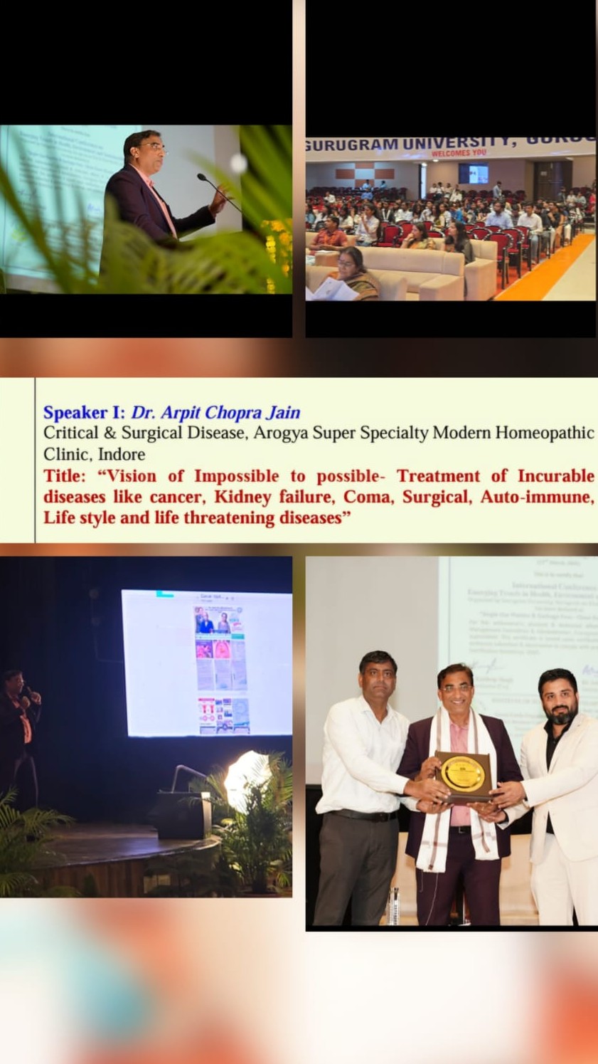 Highlights - International Conference ETHES 26 - Dr Arpit Chopra Jain Homeopathy Presentation https://youtu.be/7-LhyAusJ5A?si=YW2Gg4h5SKllQ2w International Conference ETHES 2026 Gurugram Univercity Haryana - Dr Arpit Chopra Jain Homeopathy as a Speaker on Evidence Scientific Presentation on Homoeopathy https://youtu.be/nlkrSF7LU84?si=smMSQ8j7ZlfSD4vk Emerging Trends in Environment,Health & Sustainability 2026 as a speaker Dr Arpit Chopra Jain (MD Homoeopathy) Director of Aarogya Super Speciality Modern Homoeopathic Clinic Indore & Representative of Homeopathic Medicine for BRICS Countries https://youtu.be/nlkrSF7LU84?si=smMSQ8j7ZlfSD4vk गुरुग्राम (हरियाणा)। Gurugram University में 21-22 मार्च 2026 को आयोजित अंतर्राष्ट्रीय सम्मेलन “Emerging Trends in Health, Environment and Sustainability (ETHES-2026)” का भव्य आयोजन किया गया। इस कार्यक्रम में विश्वविद्यालय के कुलपति Prof. Sanjay Kaushik, महापौर Raj Rani Malhotra, हरियाणा सरकार के औषधि नियंत्रक Lalit Kumar Goel सहित अनेक वरिष्ठ अधिकारी, वैज्ञानिक एवं शिक्षाविद उपस्थित रहे। साथ ही Indian Council of Medical Research (ICMR) एवं Central Council for Research in Unani Medicine के डायरेक्टर स्तर के अधिकारी भी कार्यक्रम में शामिल हुए।