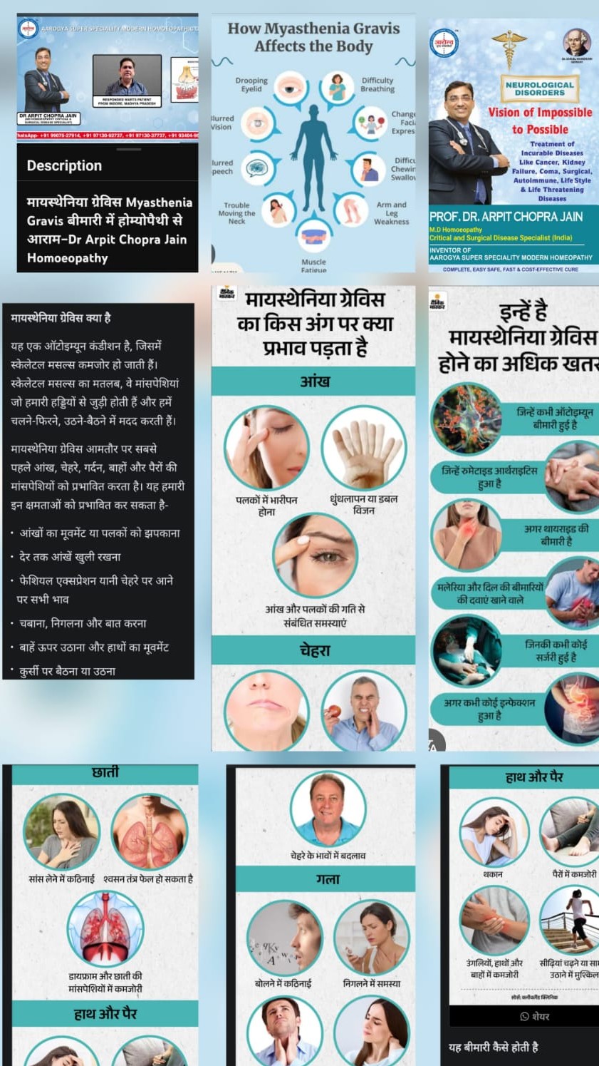 मायस्थेनिया ग्रेविस Myasthenia Gravis बीमारी में होम्योपैथी से आराम–by Added Dr Arpit Chopra Jain Aarogya Super Speciality Modern Homoeopathy Treatment in 1 month https://youtu.be/4cNFOF1kkQ8?si=3uQw3BdbBcgVmEVV also watch Diffuse Cerebral Atrophy सेरेब्रल एट्रोफी cured & reversed by Dr Arpit Chopra Jain Aarogya Super Speciality Modern Homeopathy Indore https://youtu.be/pYbb-1dp4yE?si=TzZjS5kGvm0Z62zr https://youtube.com/playlist?list=PLVzUJPWqk_g8sWzSjPe3KgTp8GpEls4Zp&si=WO6xBPygW2zfkuvY Spino Cerebellar Ataxia & Cerebral Atrophy Responded ANA Positive to Negative by Dr Arpit Chopra Jain Aarogya Super Speciality Modern Homoeopathy https://youtu.be/OoSoY9FvQ-Q?si=zDq-sxc_nINh7ukF Also watch तेज़ सुधार सिर्फ़10 दिनों में Neurological Impairment due to Brain TB Responded by Dr Arpit Chopra Jain Aarogya Super Speciality Modern Homoeopathy treatment addition, https://youtu.be/485kCHzIQy4?si=SJjIyK51Kg69PIs4 NEUROLOGICAL BRAIN DISEASES न्यूरोलॉजिकल बीमारी MANY TYPES CURED &,RESPONDED BY DR ARPIT CHORA JAIN AAROGYA MODERN HOMEOAPTHY https://youtu.be/Fwa6zNX3Y_E . Watch also many Neurological & Autoimmune cured & responded patients of Brain tumour,Cancer paralysis, Muscular dystrophy , post CVA stroke brain haemorrhage ,coma,Hospitalized unresponding critical patients ,Epilepsy,Migraine,Parkinson,MND, Cerebral Atrophy , Multiple sclerosis by Dr Arpit Chopra Jain Aarogya Suprr Speciality Modern homoeopathy for reference on https://youtu.be/VWUiqfLC3uY , https://youtube.com/shorts/FOvYhtsvmAQ?feature=share ., https://youtu.be/CgvnE3v_DUs , https://youtube.com/shorts/3-TlCl0ttGs?feature=share , https://youtu.be/R7-RcCpCTgg , https://youtu.be/mxEr-ftaMNg , https://youtu.be/sfUem6iFTHU , https://youtu.be/NBzilPw1MxI, https://youtu.be/0D7Ev14tlOs, https://youtu.be/d62ta5iv3R8, https://youtu.be/2rFyEQXmX5U & https://youtu.be/9kkJkTDRnpA. .This positive body response with life saving effords by Modern homoeopathy had been also apprecited by Neurologist also 🙏 Dr.Arpit Chopra Jain (MD HOMOEOPATHY & Critical & Surgical Disease Specialist)