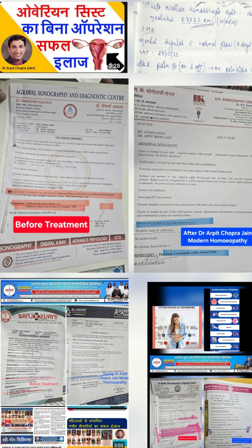 Ovarian Cyst around 3 CM dissolved in minimum 15 days by Dr Arpit Chopra Jain Aarogya Super Speciality Modern Homoeopathy https://youtube.com/shorts/Ih1A_6BXrbM?si=zogFZ6eSjntp10-j स्त्री रोग Ovarian Cyst Large 6.2x3.7CM cured by Dr Arpit Chopra Jain Aarogya Super Speciality Modern Homeopathy & saved surgery https://youtu.be/jbjeU0ELQQU?si=4pozkQRL91J8qyNa. Endometrial Hyperplasia cured 16 mm to 4 mm by Dr Arpit Chopra Jain Aarogya Super Speciality Modern Homeopathy clinic saved complications & surgery https://youtu.be/dKdGf4Vj9Qw?si=-sTcRnbw8sEoJluT, lUterine Endometrial Polyp बच्चेदानी में गांठ Cured by Dr Arpit Chopra Jain Aarogya Super Modern Homoeopathy Indore https://youtu.be/O_AE8f3Vn98?si=-fMx4ucuJBkBkA2n https://youtu.be/EuaEOzqtouk?si=EiMZwbde--YynW1V Endometrial Polyp , Uterine Fibroid, Ovarian Cyst cured by Dr Arpit Chopra Jain Modern Homoeopathy saved surgery, https://youtube.com/playlist?list=PLVzUJPWqk_g9wNae8-DhwosZjrfPcHjvc&si=gSOxmkHBBX77txPN, https://youtube.com/playlist?list=PLVzUJPWqk_g9PuGVpm08gexUrS20Fjlcg&si=nGCMPpyumgu8TEcm, https://youtube.com/playlist?list=PLVzUJPWqk_g9mDTFmeSkSOtig4vBt0miC&si=ZufVC2-aNSKAbnhJ, https://youtube.com/playlist?list=PLVzUJPWqk_g-kaeViTIOO5K_n2zWyQWGD&si=az6qb9Mfha6hBi_i, https://youtube.com/playlist?list=PLVzUJPWqk_g9-6GAKAAUSJn9_QZaQASZj&si=RCBSIrLzGTXLchCx, https://youtu.be/2BwHFZz50rI?si=Y5FEsSA86Q6Tbk5Z Also watch Ovarian Cyst 6.75 x 3.85 CM Cured by Dr Arpit Chopra Jain Modern Homoeopathy Indore saved surgery. https://youtu.be/923Nxw5wxHs?si=Y9-3Y9ejNN7AzNPi Also watch FIBROID LARGE SIZED 61x43 MM DISSOLVED & CURED BY DR ARPIT CHOPRA JAIN AAROGYA SUPER SPECIALITY MODERN HOMEOPATHY INDORE & SAVED SURGERY https://youtu.be/Pw0uMVpKTYU?si=sCdKFl9IHzodQUuu Also watch Ovarian Cancer Post Operative Metastasis Patient Responded https://youtu.be/ttunAgBzrII?si=S1WAJCPH7YUE5OwC Also watch Fibroid बच्चेदानी में गांठ up to 8 cm dissolved without surgery by Dr Arpit Chopra Jain Aarogya Super Speciality Modern Homeopathy clinic Indore https://youtu.be/5yJhtCrskCU?si=iIEebsiH2g8Rn6Pp Fibroid Large size up to 8 cm dissolved without surgery by Dr Arpit Chopra Jain Aarogya Super Speciality Modern Homeopathy Indore https://youtu.be/Z24vGtkyF6I?si=9uc-e9p5JtxvRsLT, https://youtu.be/bMhAQpVa-s8?si=vIbQDXvj4NjH1bJt, https://youtu.be/0_rPpEF4s-Q?si=eV1dyUktEQmaQK-a Also watch Ovarian Cyst , Abdominal Lymphadenopathy Cured by Dr Arpit Chopra Aarogya Super Modern Homoeopathy https://youtu.be/ELBhf-FTMV8?si=P4kccM0TrpgRCmsv, https://youtu.be/fJBuJzj4N1Y?si=thsduq1E6qgSso6jb Also watch Ovarian Cyst 3.5 cm & Bulky Uterus Thickened Endometrium 13 mm Cured without surge. ry & saved complications by Dr Arpit Chopra Jain's Aarogya SuperSpeciality Modern Homoeopathy https://youtu.be/BcyDGTNXU_4?si=dRuBTEUlbqJklCjQ UTERINE FIBROID LARGE up to 9 CM Cured & dissolved without surgery BY DR ARPIT CHOPRA JAIN MODERN HOMOEOPATHY. https://youtu.be/Bf3obMEteWI?si=z9Wa1ovh_vYX1c5p. Also watch Endometrial polyp with 19 mm Hypertrophied Endometrium Cured by Dr Arpit Chopra Jain Modern Homeopathy https://youtu.be/lIjhAew1Ir8 Utetine fibroid large 6 cm sized dissolved by Dr Arpit Chopra Jain Modern Homeopathy without surgery https://youtu.be/IwS26dD16PI .Also watch Adenomyosis & heavy menstrual bleeding cured by Dr Arpit Chopra Modern Homeopathy in 21 days https://youtu.be/27lkmqTjw_I . Watch Uterine Fibroid with Bulky Uterus cured without surgery by Dr Arpit Chopra Jain Modern Homoeopathy https://youtu.be/-2CCLS_YK4s. Watch Ovarian Cyst Large 3.9x3.6 cm cured only in 1 month without surgery by Dr Arpit Chopra Modern Homoeopathy https://youtu.be/_r-gH5Owg7E , . WATCH MANY FEMALE GYNAECOLOGY DISEASE महिलाओं स्त्री रोग संबंधी MANY TYPES CURED BY DR ARPIT CHOPRA JAIN MODERN HOMEOPATHY TO LIFETIME DRUG DEPENDENCY, SAVE COMPLICATION & SURGERY LIKE UTERINE FIBROID, BULKY UTERUS, CERVICAL POLYP , OVARIAN CYST (HAEMORRHAGIC ) OF LARGE SIZED CERVICAL CANCER, OVARIAN CANCER, PCOD, PCOS ENDOMETRIUM CANCER DIFFERENT MULTIPLE SURGICAL ADVISED CASE CURED & dissolved successfully miraculous in quick time by only Modern Homoeopathy without surgery. This positive miracall surgery saving response of Modern Homoeopathy with patients reports and feedback had been also appreciated by GYNAECOLOGIST👍. I am also giving pre and post reports of Modern Homoeopathy miracle treatment for reference on https://youtu.be/1t7PsMXDPoE, https://youtube.com/shorts/h-IuizT8WFQ?feature=share , https://youtu.be/pvkLEeA9L9g , https://youtu.be/yRP0I0RXoeI , https://youtu.be/5XwK78cBXnY , https://youtu.be/1sVNUYYi0D0 , https://youtu.be/Z5K424iTMHM , https://youtu.be/r9jzJKtsAZw , https://youtu.be/J010cIbSMco , https://youtu.be/7ABXCHi_ius , https://youtu.be/8Vu0bAuX1iY, https://youtu.be/jemxW9i5s1M, https://youtu.be/VuNyKv41RxA, https://youtu.be/OLnFcFcQWP4, https://youtu.be/7iM0HlS9BHk . https://youtu.be/lRhhvEk1aAc ,Regards-Aarogya Super Speciality Modern Homoeopathic Clinic ,Dr.Arpit Chopra Jain (MD Homoeopathy & Critical @Sur