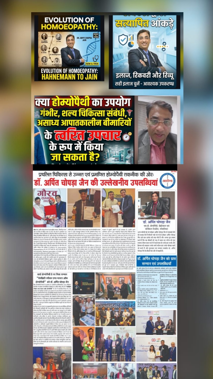 क्या होम्योपैथी का उपयोग गंभीर, शल्य,असाध्यआपातकालीन बीमारियों के त्वरित उपचार में किया जा सकता है? https://youtube.com/shorts/W56HdV2Kznw?si=FeCO7j3ovdTO7pi 3000+ सफल उपचार की कहानियां – असंभव को संभव बनाने का सपना – डॉ. अर्पित चोपड़ा जैन होम्योपैथी 3000+ Success Treatment सफल उपचार –Vision of Impossible to Possible –Dr Arpit Chopra Jain Homeopathy, Many Diseases Cured & Responded Patient Report with Vision of Impossible to Possible by Dr.Arpit Chopra Jain Aarogya Super Speciality Modern Homoeopathic Clinic Indore https://youtu.be/3kH3ONfPzug?si=pdi-789lsjfESR3t https://youtu.be/sNns9g0Cg14?si=o6yvctP-jnQQa7iG डॉ. अर्पित चोपड़ा जैन की पुस्तक का विमोचन, जिसका विषय है "होम्योपैथी द्वारा असंभव को संभव का प्रयास", कोलकाता में एचएमएआई के स्वर्ण जयंती समारोह में हुआ।dr Arpit Chopra Jain 's book inaugral on Topic Vision of Impossible to Possible by Homoeopathy in Kolkata Goldan Jubli event of HMAI https://youtu.be/lc41nXxMz24?si=-Uw2QNrWAdQVc-Tp असंभव को संभव बनाने का दृष्टिकोण - डॉ. अर्पित चोपड़ा जैन आरोग्य सुपर स्पेशलिटी मॉडर्न होम्योपैथिक Vision of Impossible to Possible -Dr. Arpit Chopra Jain Aarogya Super Speciality Modern Homoeopathic clinic Indore https://youtu.be/46g8P2uLyfs?si=XqSU1YY1j0eSQOIi VISION OF COMPLETE, EASY, SAFE, FAST & COST EFFECTIVE