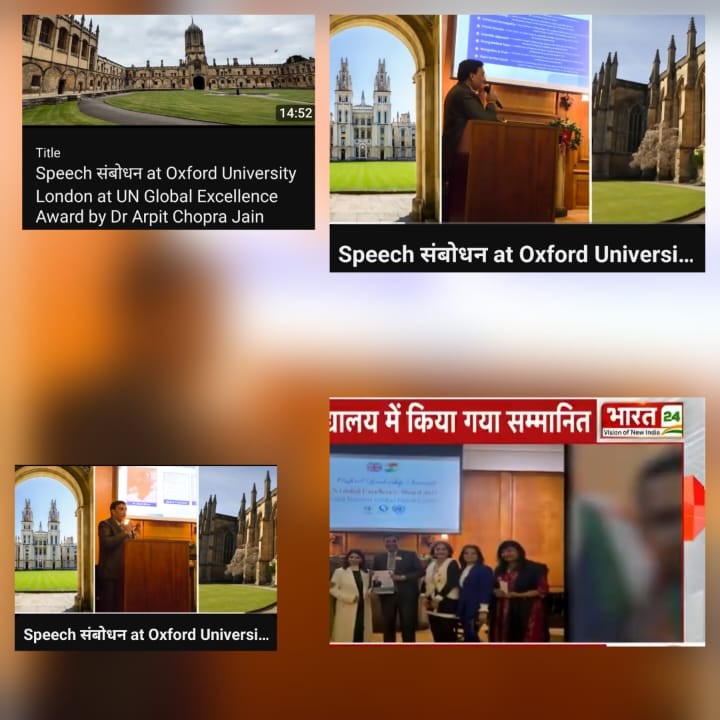 18. Guest of honour at United Nations Peace Council Global Excellence Award at Newyork in June 2025 19) Awarded & Invited at Global Health & Wellness Summit at Vietnam at July 2025 20 ) invited as Guest of Honour at United Kingdom Parliament House of Lords & Honoured as London Awards of Excellence in Sep 2025 21] Global Leadership Summit at Mauritus & Awarded by Ex President of Mauritus Mr Prithviraj ji Rupal at Sep 2025. 22) Oxford univercity London United kingdom honoured & invited Dr Arpit Chopra Jain as guest speaker बढ़ता भारत, उभरता भारत...