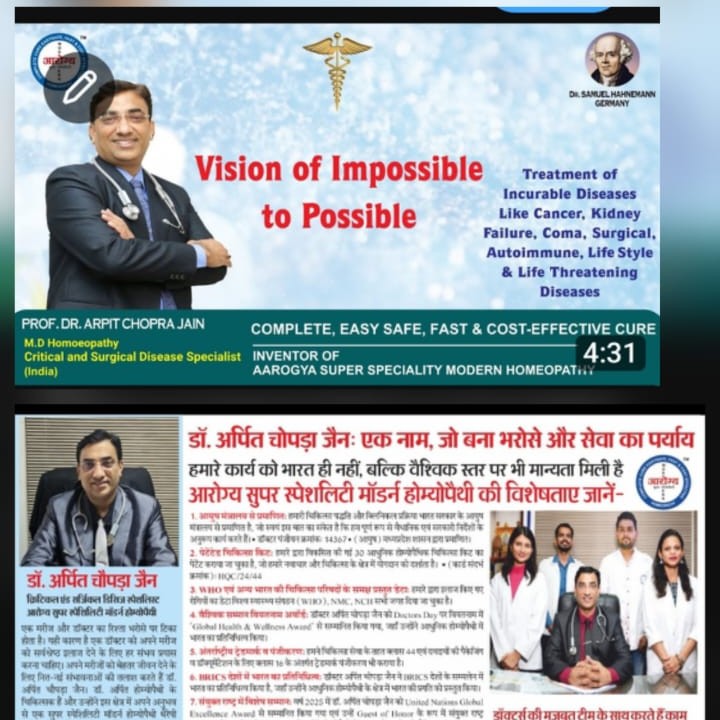 HEALTH CURE WITH ADVANCED LIFE STYLE TO SAVE LIFETIME DRUG DEPENDENCY & SURGERY at Aarogya Super Specialty Modern Homeopathic Clinic Dr. Arpit Chopra Jain (MD Homeopathy & Critical & Surgical Disease specialist , Inventor of Aarogya Super Specialty Modern Homeopathy),101,102,103 & 104 Krishna Tower,Opposite Curewell Hospital,Janjirwala chouraha, New Palasia, Indore,PIN-452001. https://youtube.com/@drarpitchoprajain?si=90y3L37A2NWFcCgB, https://www.justdial.com/DT-29YD4NDP & Website- www.homoeopathycure.in, Aarogyahomoeopathyindore.com,+91-9926039260,9907527914,7999978894,9713092737,0731-4977076